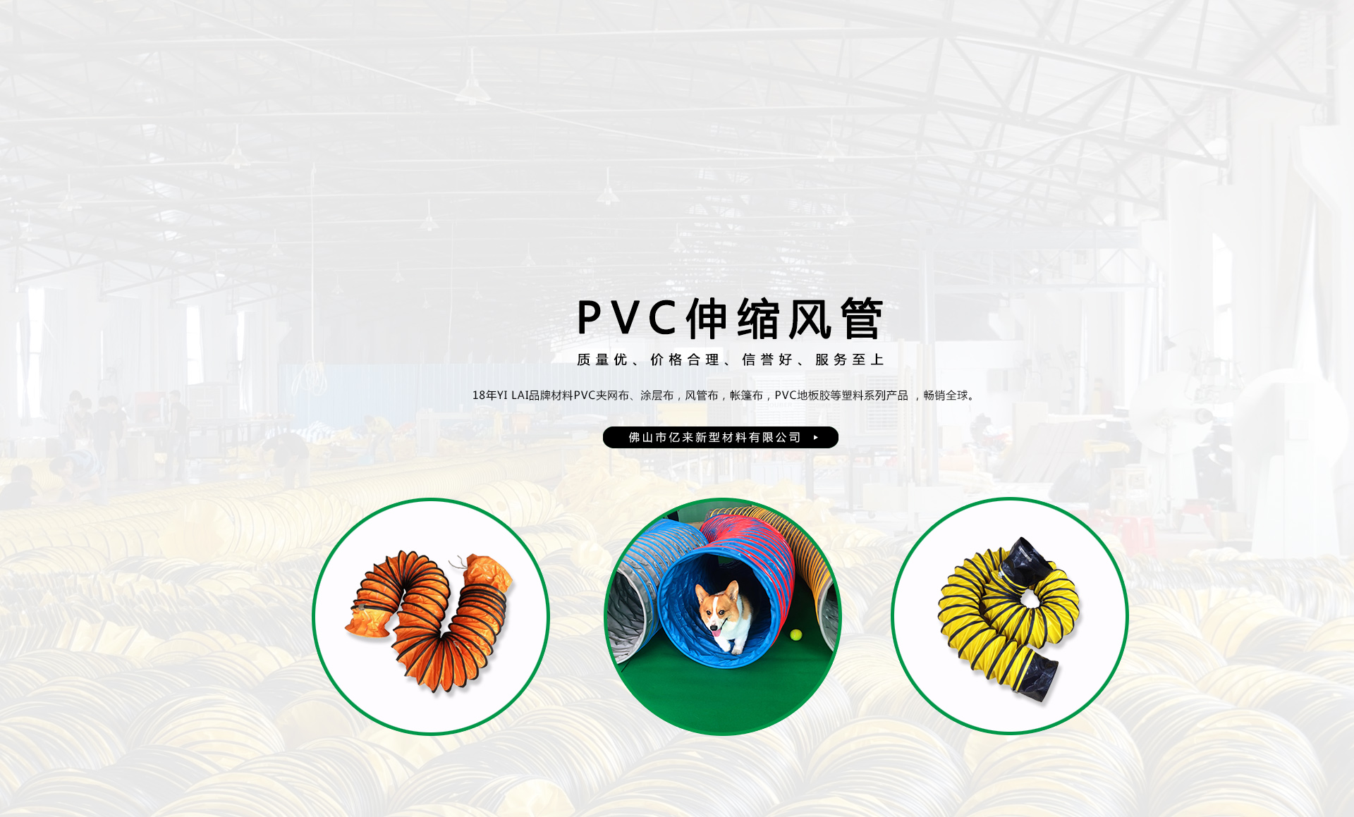 創(chuàng)建“YILAI品牌”近20年來,產(chǎn)品質(zhì)量穩(wěn)定提高,生產(chǎn)及經(jīng)營的產(chǎn)品包括PVC夾網(wǎng)布、PVC彩條布、PVC風管布、PVC涂層布、PVC籬笆圍護欄布、PVC透明夾網(wǎng)布、PVC伸縮風管、車縫風管、寵物管、耐高溫風管、地下室通風管,保溫通風管、空調(diào)排風管、正負壓通風管、三通/四通排風管、防靜電風管、隧道風管、PVC地板膠等系列產(chǎn)品在市場上得到廣大客戶認可,暢銷歐美、東南亞、非洲、中東等國外市場。